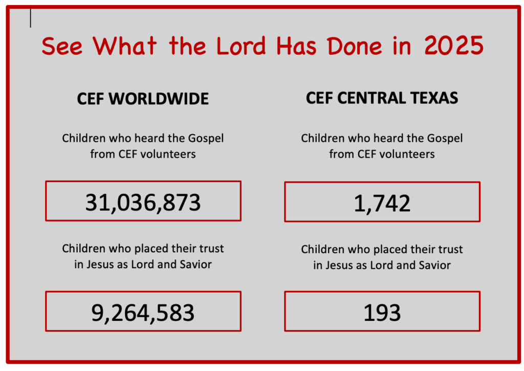 We currently have three staff members and 156 volunteers all sharing the gospel of the Lord Jesus with children in Central Texas. Jesus has opened the door to 45 locations including elementary school campuses, day care centers, community youth centers, apartment complexes, and church buildings. Throughout Central Texas, the Lord is working through CEF volunteers to tell children about Jesus!